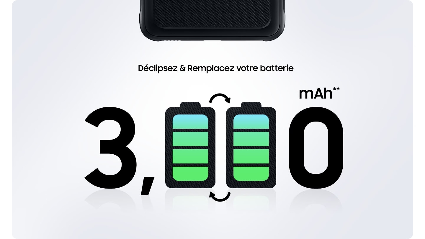 Avec une batterie de 3 000 mAh, le Galaxy XCover 5 offre une autonomie fiable pour une utilisation continue tout au long de la journée de travail. De plus, la fonction de chargement rapide vous permet de recharger rapidement votre téléphone, vous assurant ainsi de rester connecté sans interruption, même lors de journées chargées. Vous pouvez également remplacer votre batterie facilement par une batterie interchangeable** lorsque vous êtes à court d'énergie.